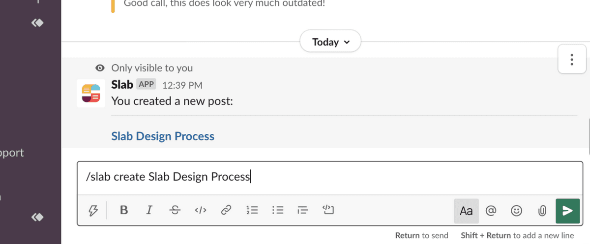- Once you are in the desired channel or workspace, use the designated command or keyword (specific to the Slack and Slab integration) to initiate the creation of a new post. This command can be as simple as typing "/newpost" or a similar instruction.